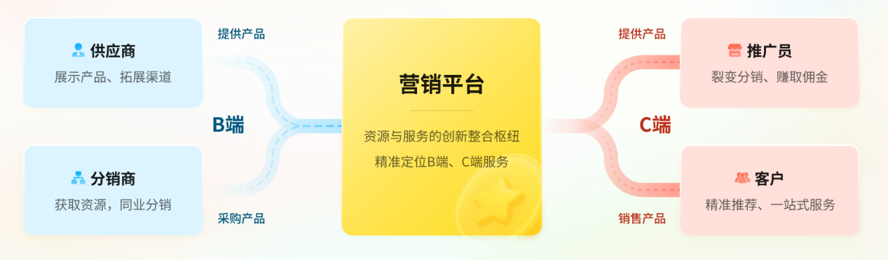 面對這些“散、亂、難”,行業(yè)開始尋找答案:一張能連接一切的“智慧之網(wǎng)”。這張網(wǎng),要能整合分散的資源(B 端供應商),打通多元的分銷渠道(B 端分銷商),更要能精準觸達和服務最終消費者(C 端),形成高效協(xié)同的生態(tài)。它不僅僅是工具,更是賦能運營、激活價值的底層操作系統(tǒng)。