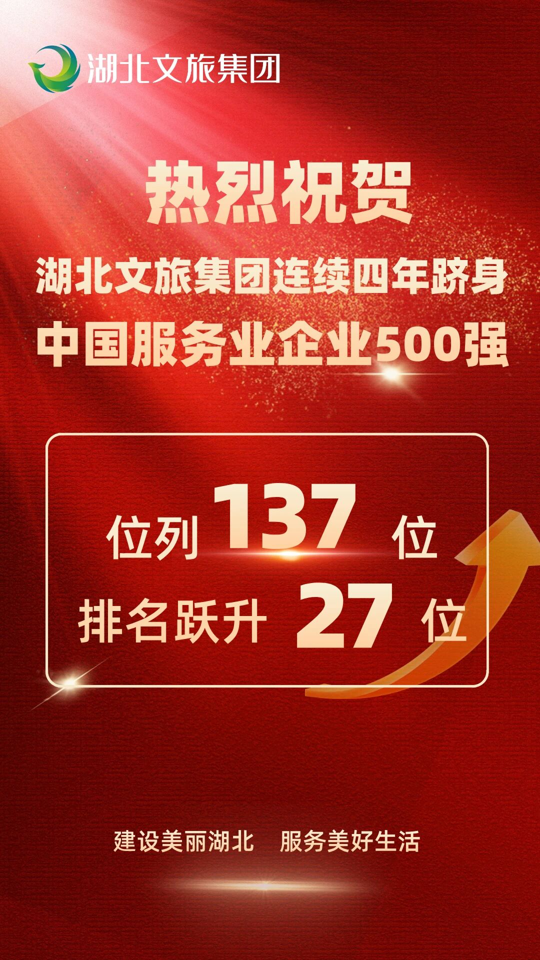 湖北文旅集團再上榜中國服務業(yè)企業(yè)500強,排名第137位。9月18日,中國企業(yè)聯(lián)合會、中國企業(yè)家協(xié)會在重慶發(fā)布“2025中國服務業(yè)企業(yè)500強”榜單。湖北文旅集團憑借2024年604.80億元的營業(yè)收入,再度躋身榜單,實現(xiàn)連續(xù)四年上榜,排名第137位,較2024年躍升27個位次。近年來,集團聚焦“四化轉型”,系統(tǒng)推進“穩(wěn)增長、調結構、新產品、盤存量”四大行動,加速構建主業(yè)突出、鏈條完整、效能卓越的文旅現(xiàn)代產業(yè)體系,為湖北建設世界知名文化旅游目的地貢獻力量。